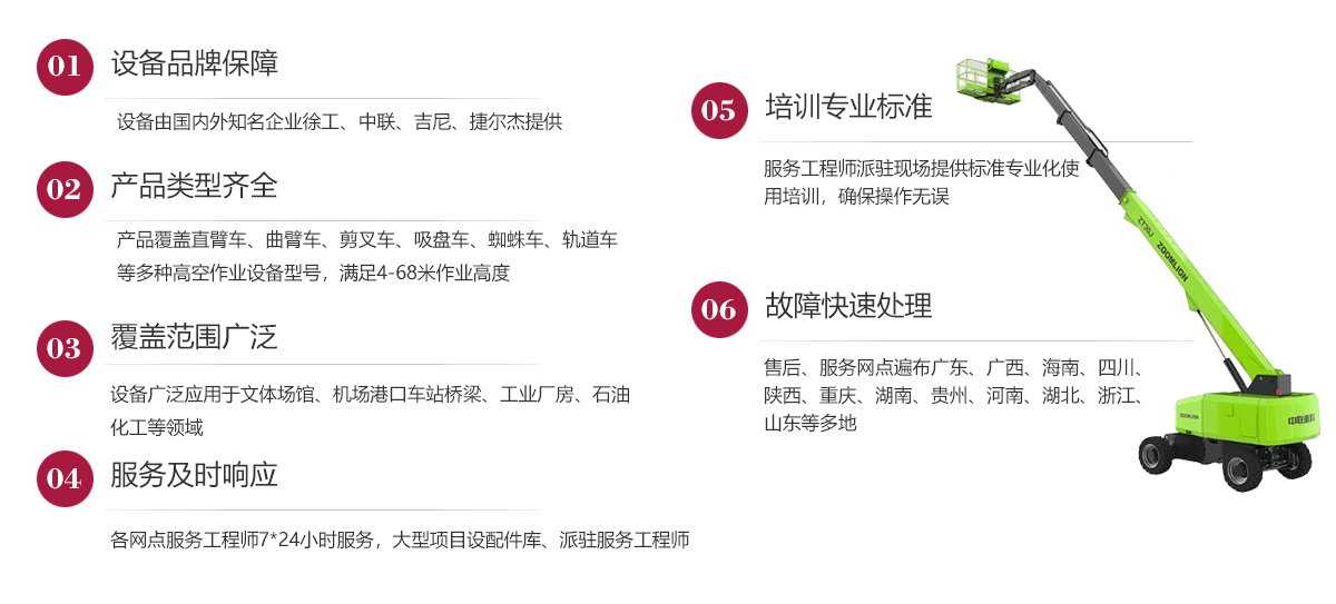 公司在發(fā)展歷程中堅定實行大客戶戰(zhàn)略,致力于以優(yōu)質(zhì)的服務(wù)打造公司的品牌和核心競爭力,現(xiàn)已在廣東、廣西、海南、四川、陜西、湖南、重慶、河南、湖北、貴州等多地建立了完善的售后服務(wù)網(wǎng)點,24小時為客戶排憂解難。今后我們將結(jié)合市場需求,不斷創(chuàng)新業(yè)務(wù)模式、優(yōu)化設(shè)備結(jié)構(gòu)、加強運營管理、擴大服務(wù)網(wǎng)點、提升服務(wù)水平,形成以設(shè)備租賃、銷售、二手設(shè)備交易等全方位一站式的全面服務(wù)體系,用高標(biāo)準高質(zhì)量的服務(wù)讓客戶在和公司合作的過程中實實在在感受到省心、省力、省錢的體驗,在客戶心目中樹立“家鋒”的品牌形象。